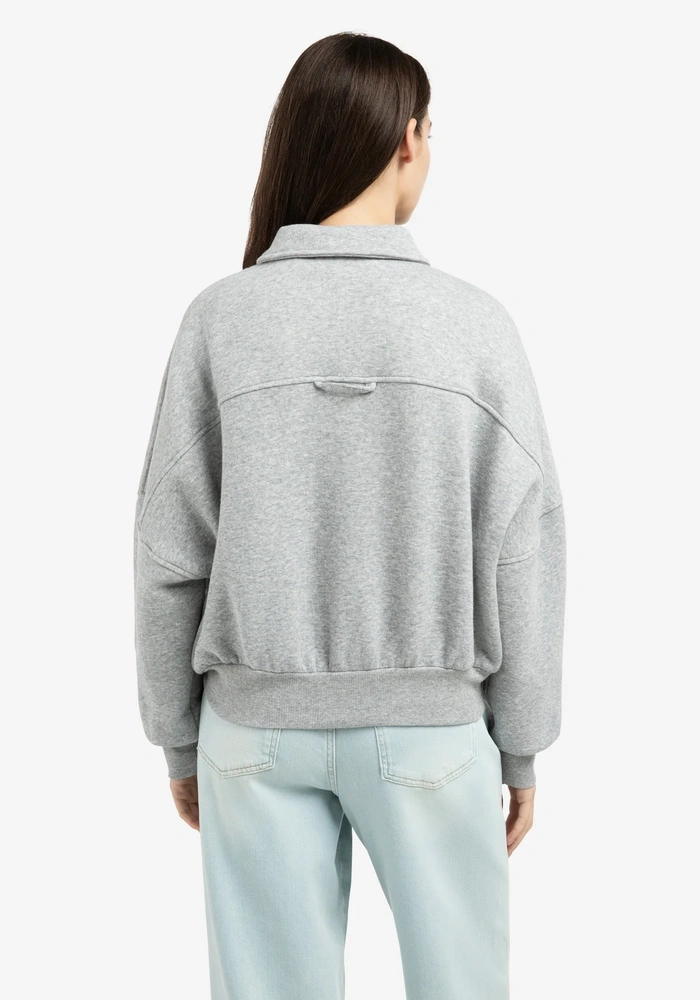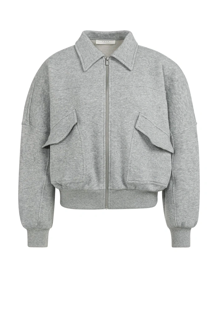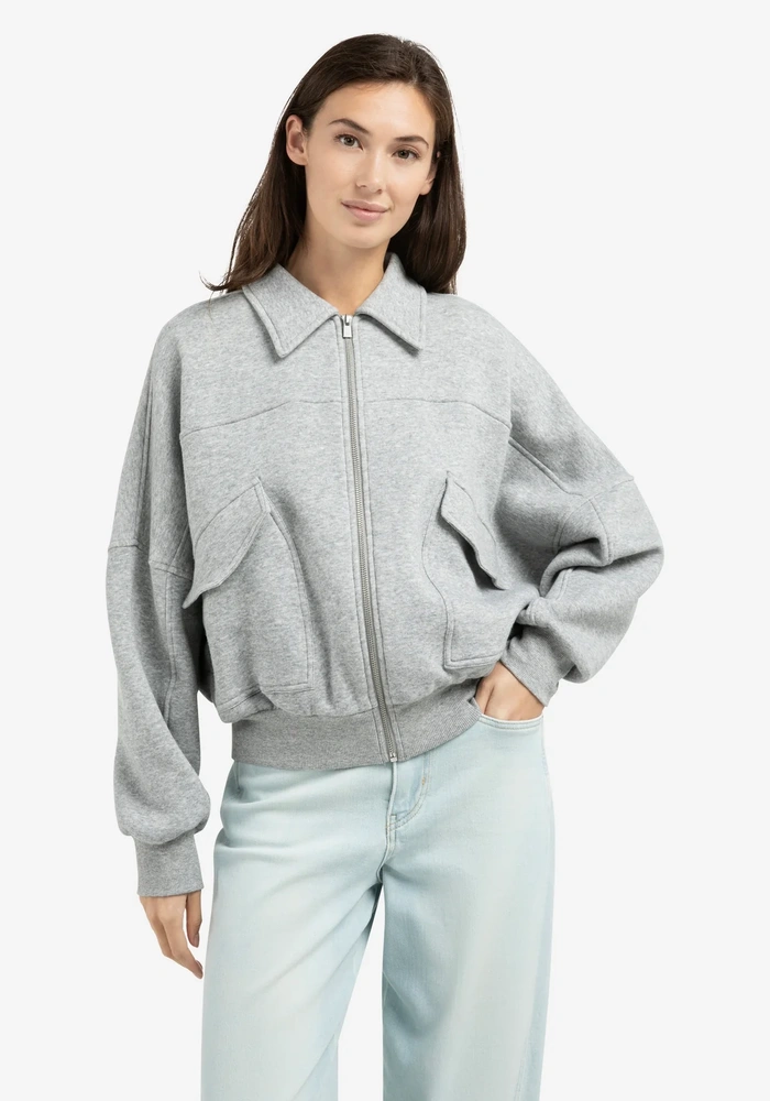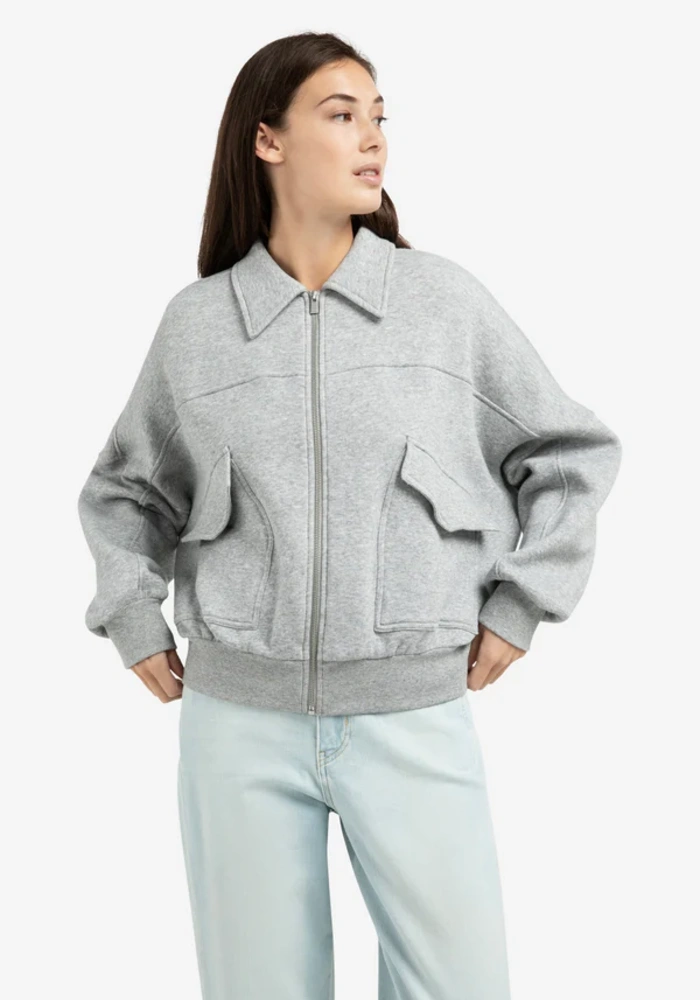 Dit comfortabele sweatjasje heeft een oversized pasvorm en is gemaakt van zachte katoenmix. Het is voorzien van een opstaande kraag, ritssluiting en opgestikte klepzakken voor een stoere, casual uitstraling. Geribde boorden aan mouwen en zoom zorgen voor een subtiel contrast, perfect voor een sportieve look met een moderne twist.