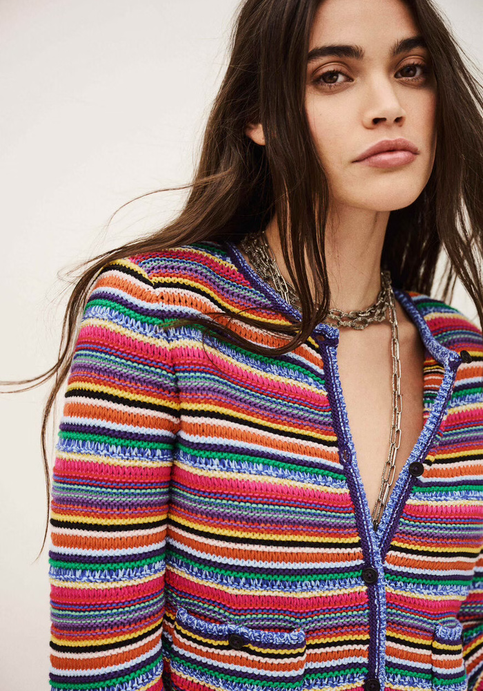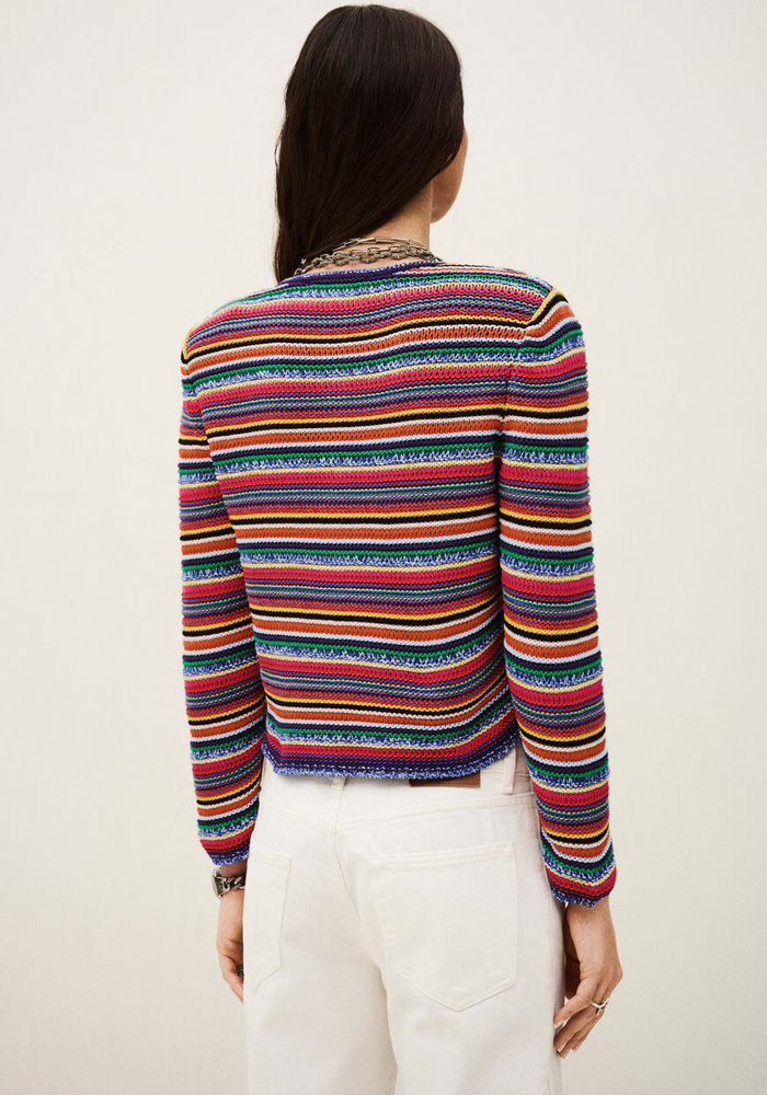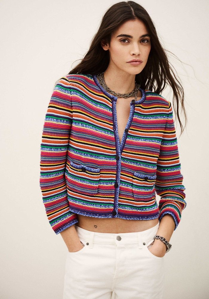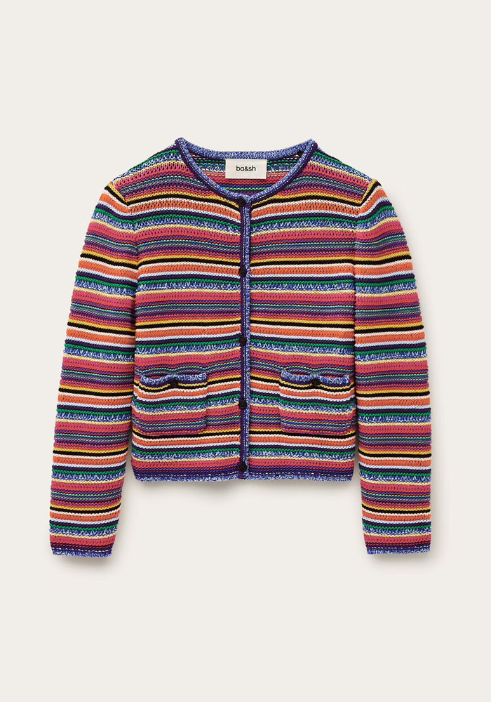 De Ba&sh Fanny Cardigan in multicolor is een comfortabel gestreept vest met 3/4 mouwen, ronde hals en twee opgestikte zakken. Gemaakt van een mix van jersey en ribbelsteek voor een relaxte, veelzijdige pasvorm.