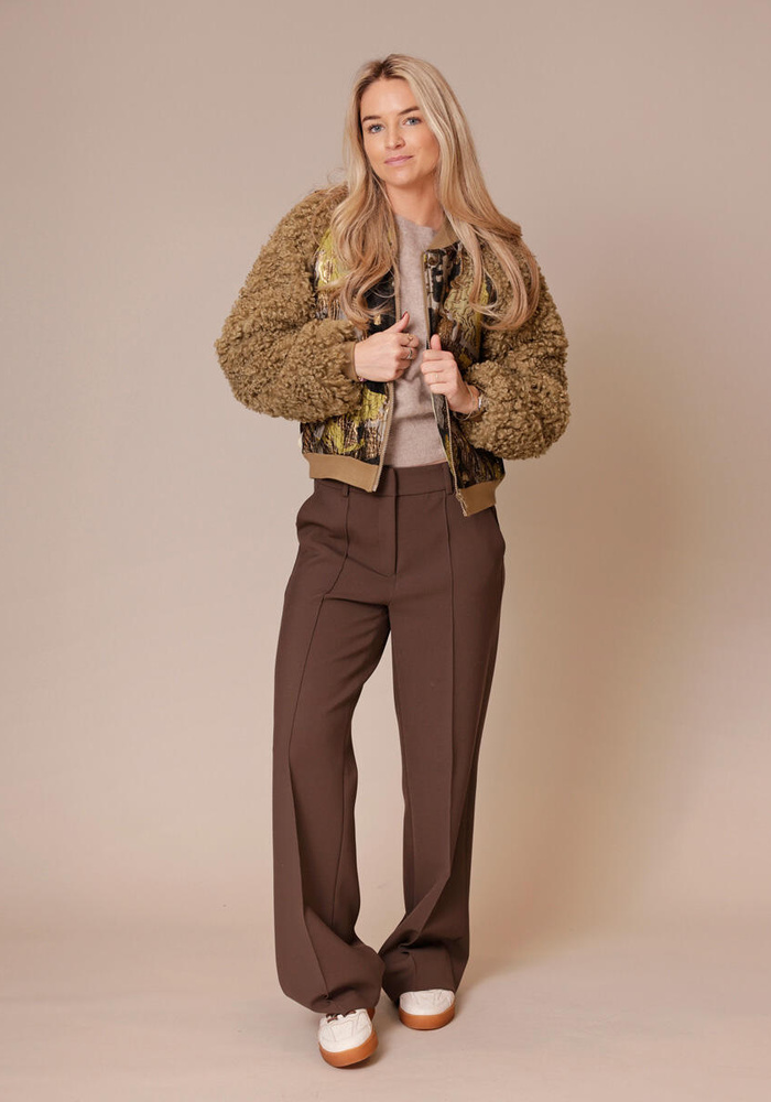 Jacquard Summum bomber met opvallend patroon en teddy mouwen. Licht gewatteerd, met satijnen voering en zachte ribboorden – ideaal als tussenjas of indoor jacket.