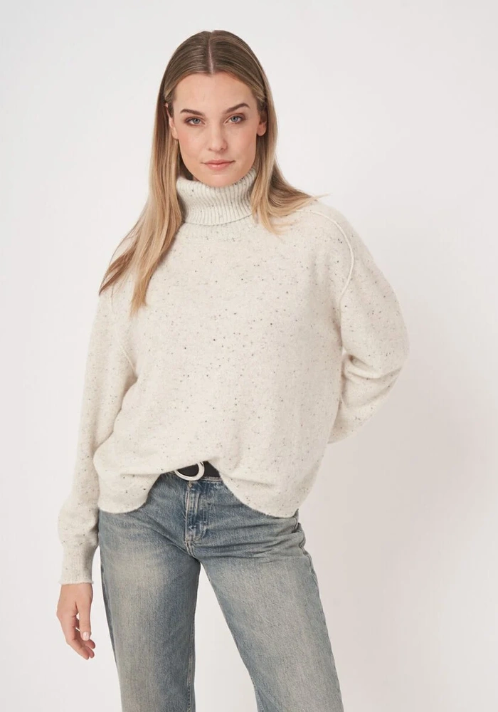 Deze sweater van Repeat heeft lange zadelmouwen met ribgebreide manchetten en een ribgebreide zoom. Het subtiele gestippelde patroon in luxe tweedgaren en de buitenliggende naden maken het design bijzonder.